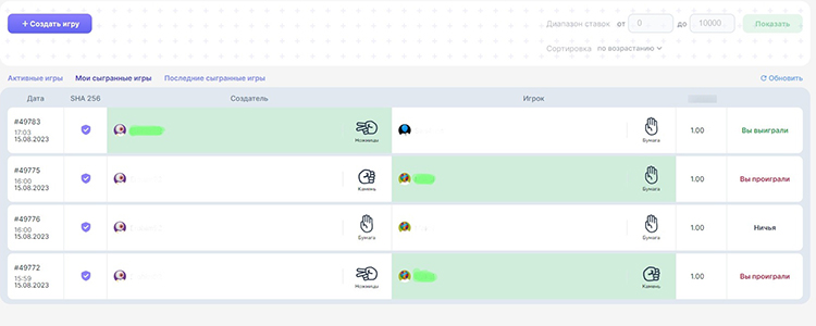 All bets are made using the internal currency – points. To proceed to the game you need to select one of the created games in the main lobby or add your own. Filters are provided for more precise search. You can set the bet size range and sort the games by creation date. After clicking on the “Play” button you need to select a stone, scissors or paper and confirm the action.
